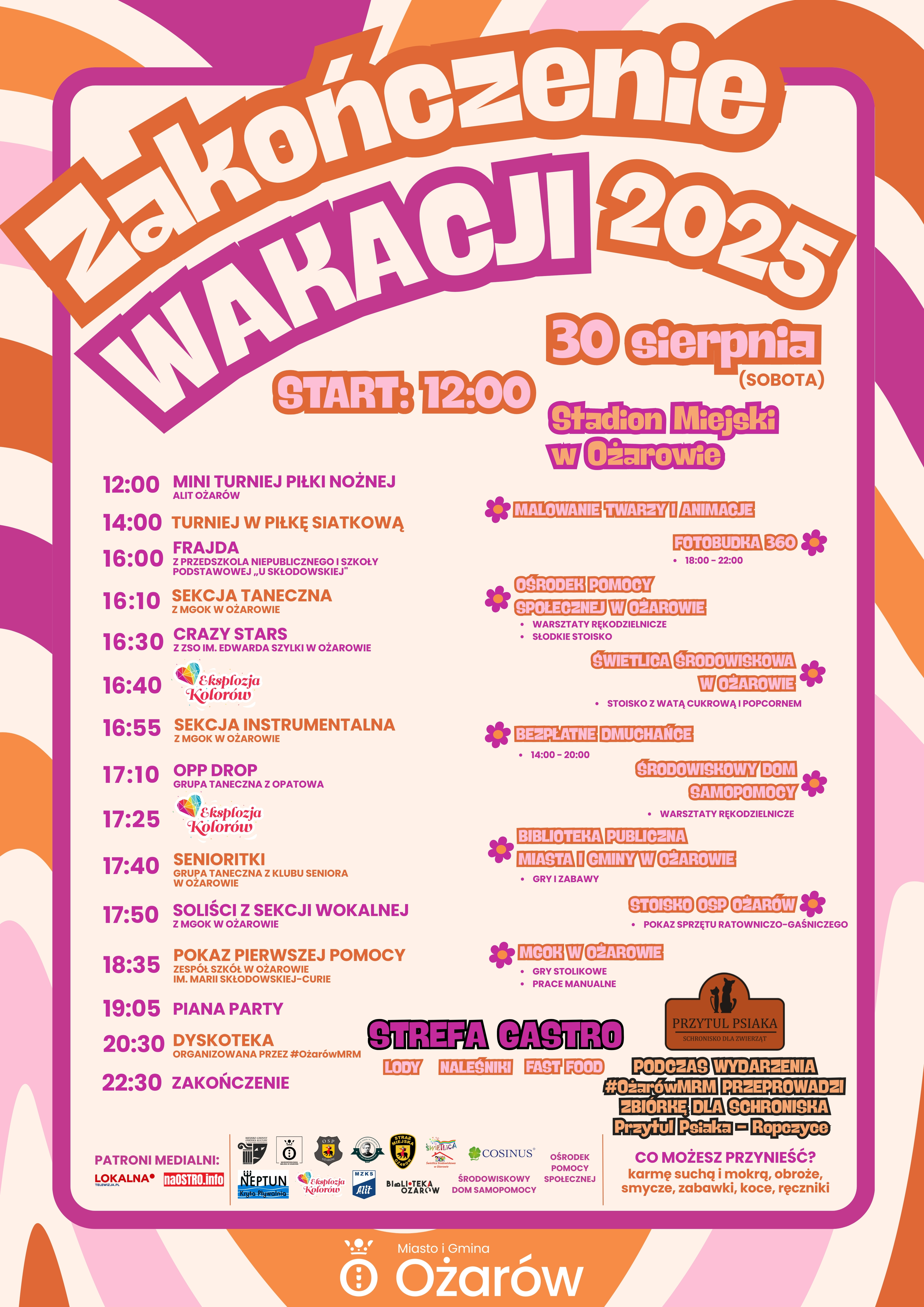 Serdeczenie zapraszamy wszystkich na zakończenie wakacji 2025, które odbędzie w dniu 30.08.2025 r. (sobota) na stadionie miejskim w Ożarowie.