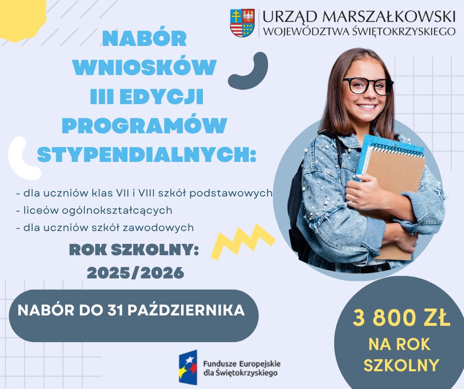 1 października 2025 w Urzędzie Marszałkowskim Województwa Świętokrzyskiego rozpoczął się nabór wniosków o przyznanie stypendium dla studentów I roku publicznych uczelni technicznych i akademickich. Uruchomiony został także nabór w ramach świętokrzyskich programów stypendialnych dla uczniów szkół podstawowych, liceów ogólnokształcących oraz szkół zawodowych.